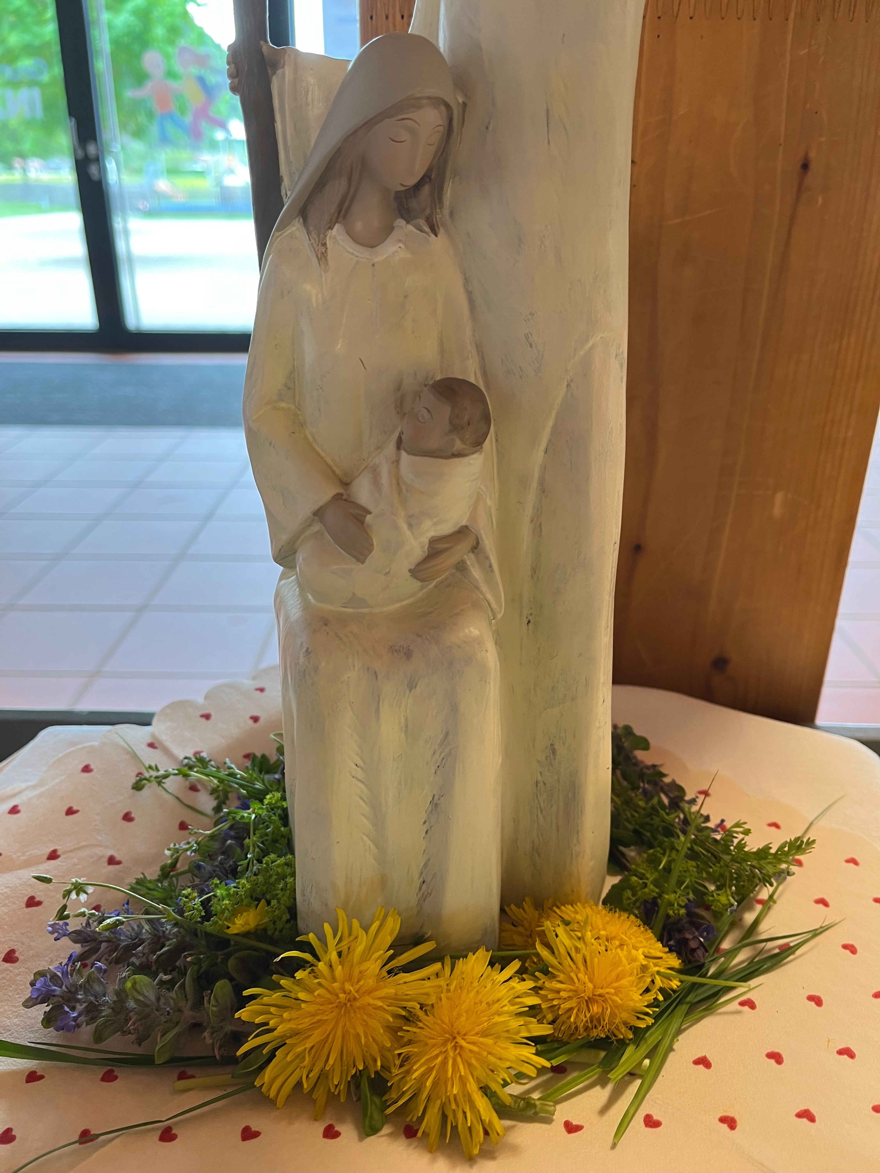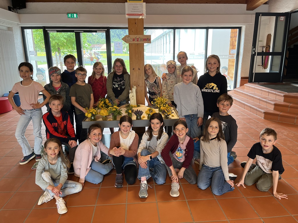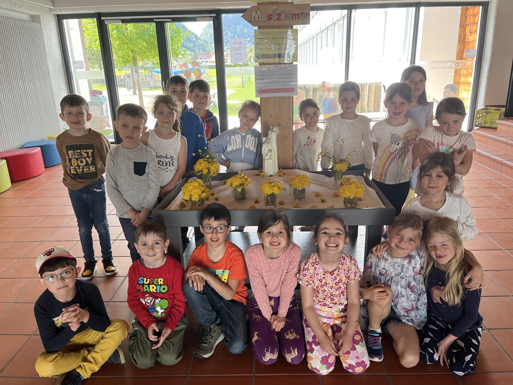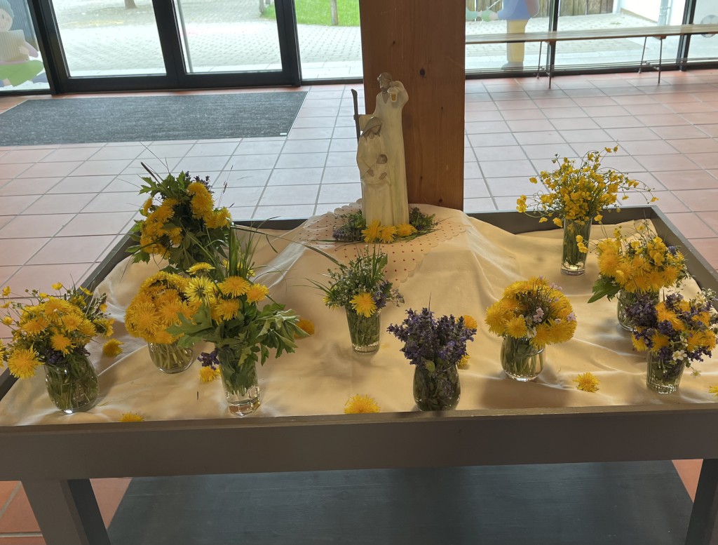 In der Schulaula gestaltete Anfang Mai die 1. Klasse zusammen mit ihrer Religionslehrerin Elke Thurmayr einen Marienaltar mit vielen schönen Wiesenblumen und einer Marienstatue. Schülerinnen der 3. Klasse kümmern sich nun täglich darum, dass die Blumen frisches Wasser erhalten oder bei Bedarf ausgetauscht werden.