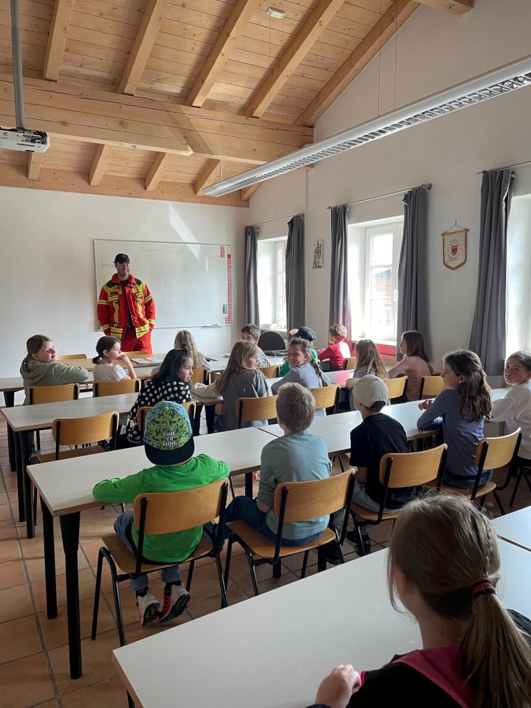 Von engagierten Feuerwehrmännern erfuhren die Schülerinnen und Schüler viel Spannendes rund um die Feuerwehr. Zunächst erhielten sie einige Informationen über das Feuerwehrhaus sowie die Anzahl der Mitglieder und Einsätze. Danach schauten sich die Drittklässler die Funkzentrale an und wiederholten die Notrufnummer 112.