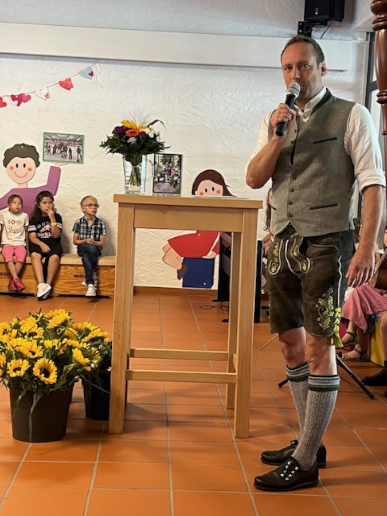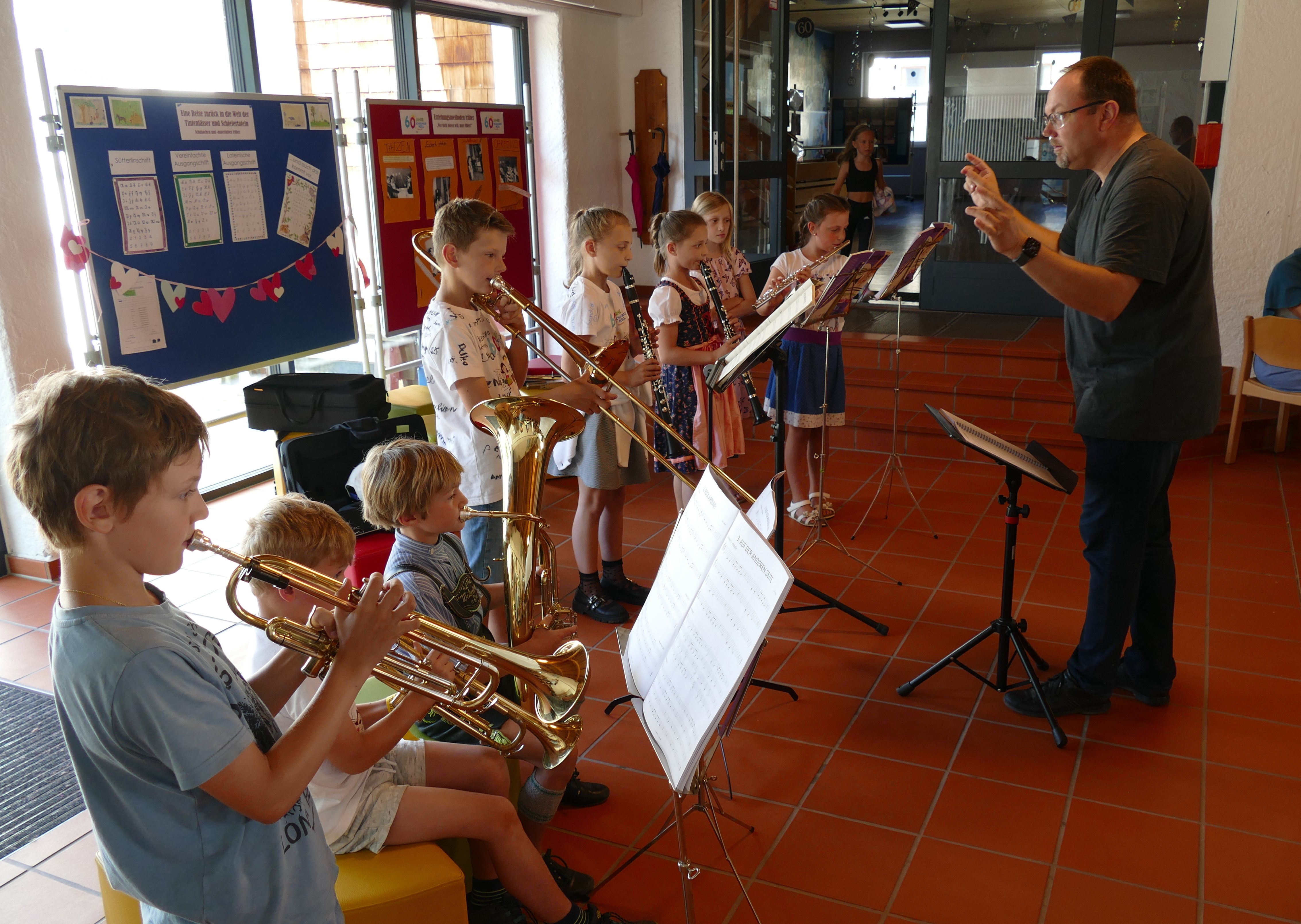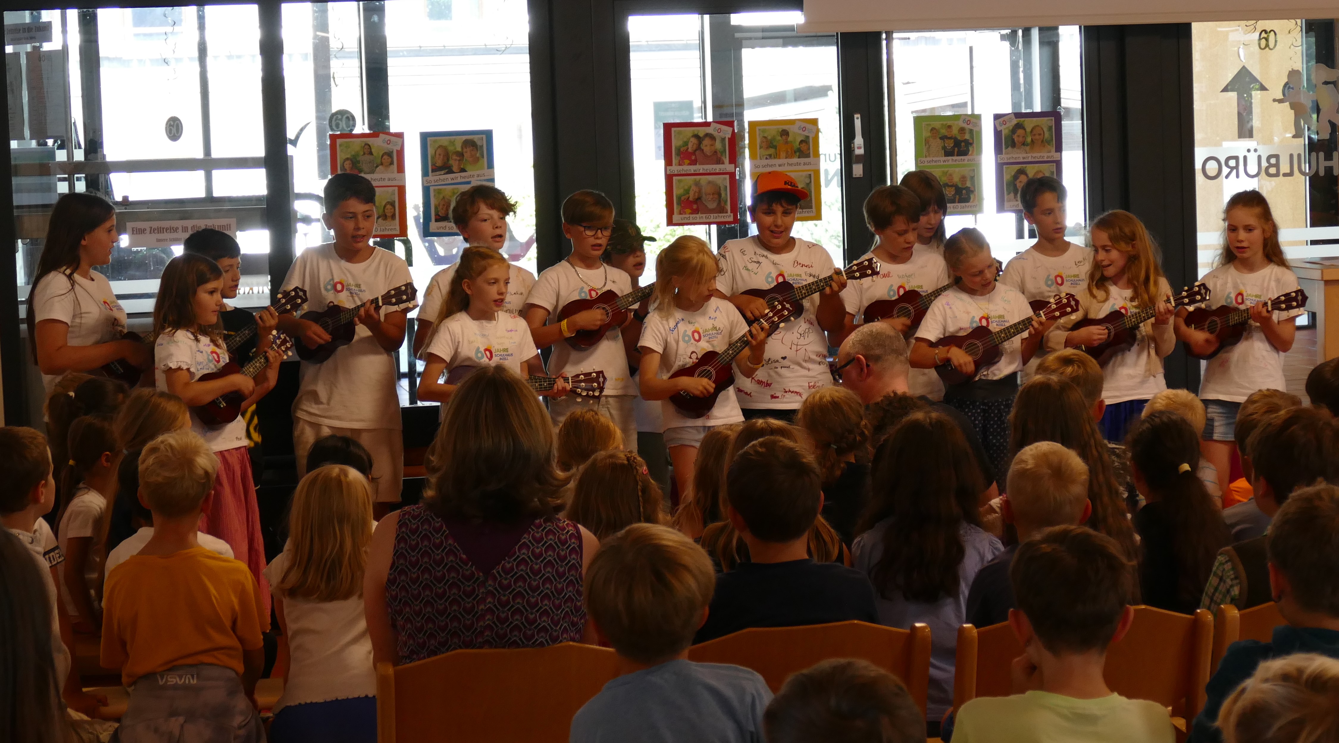 Sönke Stollenmaiers witzige und humorvolle Ansprache ließ erkennen, wie sehr er seine 4b ins Herz geschlossen hat. „Ich durfte euch von der 3. in die 4. Klasse führen und in den beiden Jahren entwickelt sich schon ein gewisses Mama/Papa Gefühl. Ihr seid mir sehr ans Herz gewachsen und wir haben viel Spaß gehabt und auch Blödsinn gemacht, aber ihr habt viel geleistet. Ihr ward eine tolle Klasse“, berichtete Stollenmaier mit ein wenig Wehmut, seine kleinen ‚Stinktiere‘ nun verabschieden zu müssen. Als Abschiedsgeschenk spielte seine 4b mit den Ukulelen sehr schwungvoll noch das Lied „Skip to my Lou“.