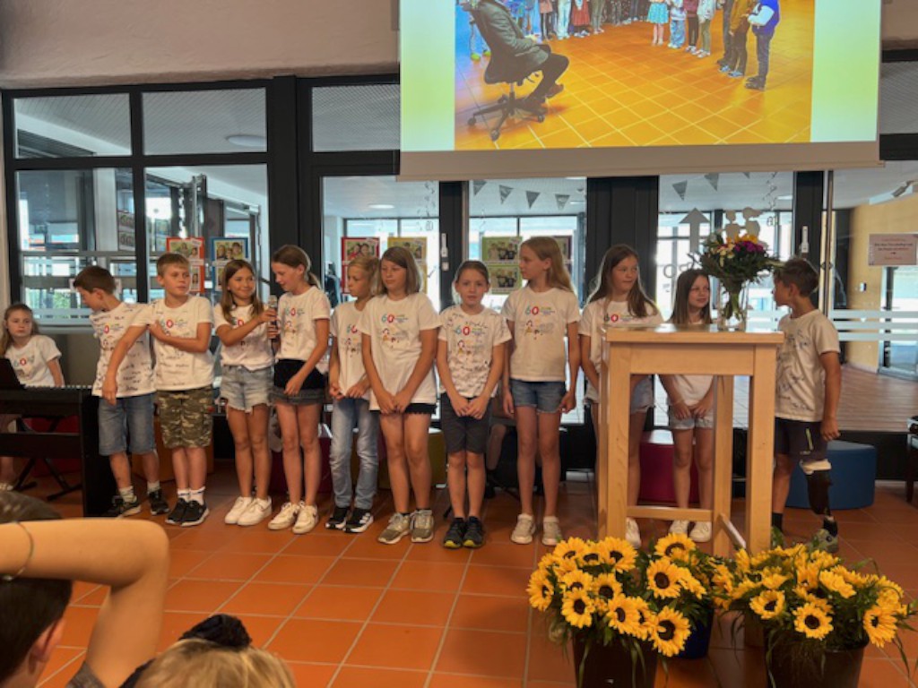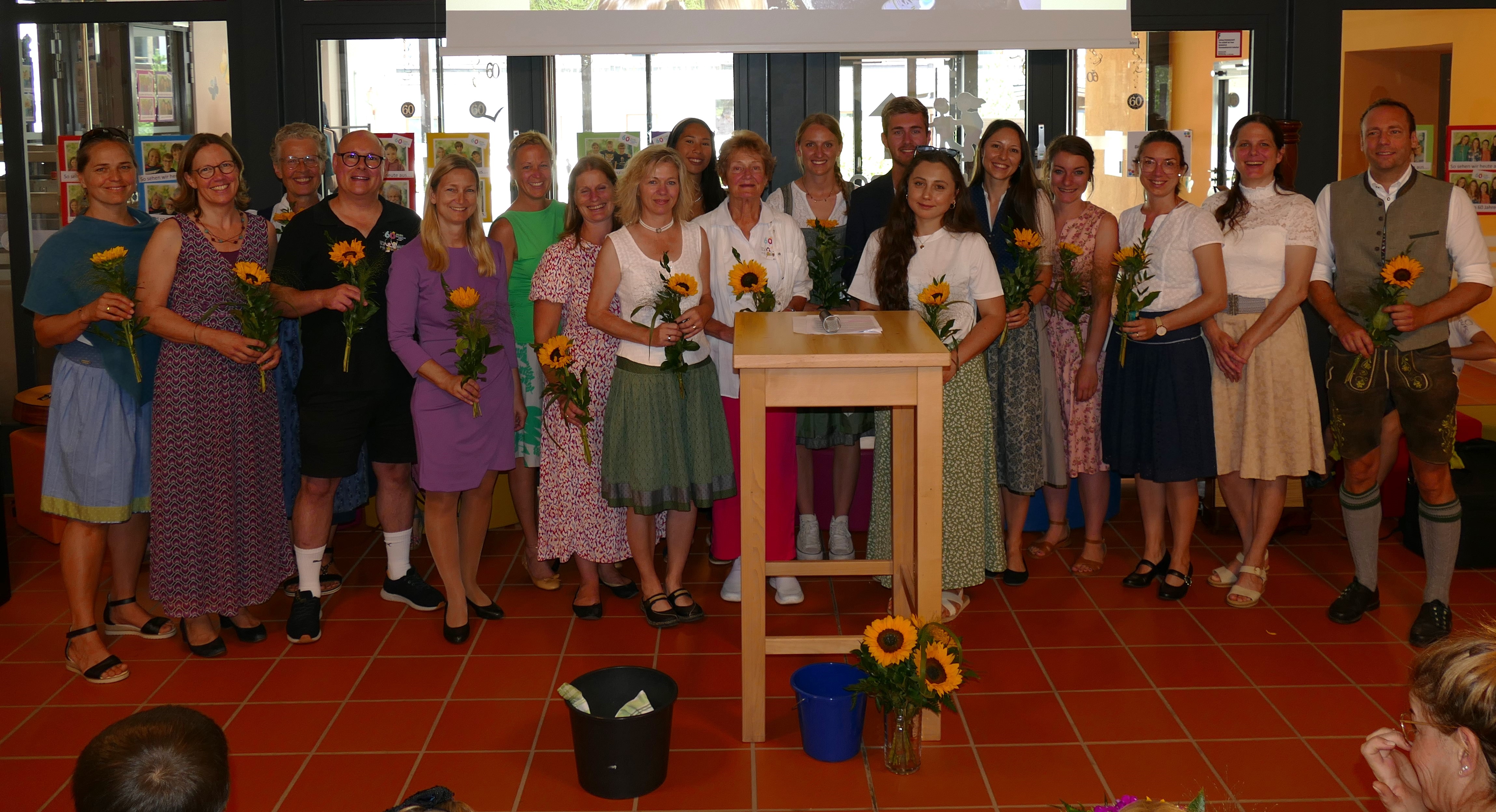 Elke Thurmayr dankte abschließend allen, deren Arbeit zum Gelingen des abgelaufenen Schuljahres beigetragen hat. Die beiden ‚Abschlussklassen‘ trugen sehr überzeugend das Lied ‚Alte Schule, altes Haus‘ vor und ernteten dafür den gebührenden Beifall. Doch auch alle anderen musikalischen Darbietungen der Schüler kamen sehr gut an und lockerten diese Abschlussfeier angemessen auf. Mit einer schönen Sonnenblume als Anerkennung für ihren Einsatz und Arbeit bekamen die Lehrkräfte und alle, die zum guten Gelingen des Schuljahres beigetragen haben, einen kleinen Dank mit auf den Weg, mit dem Wunsch auf gute Erholung in den Ferien.
