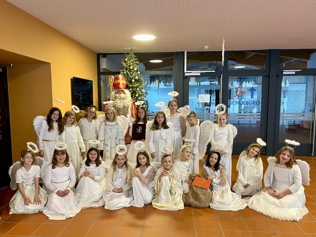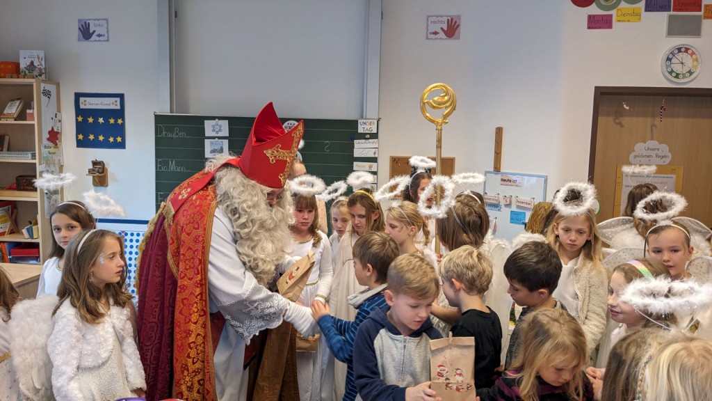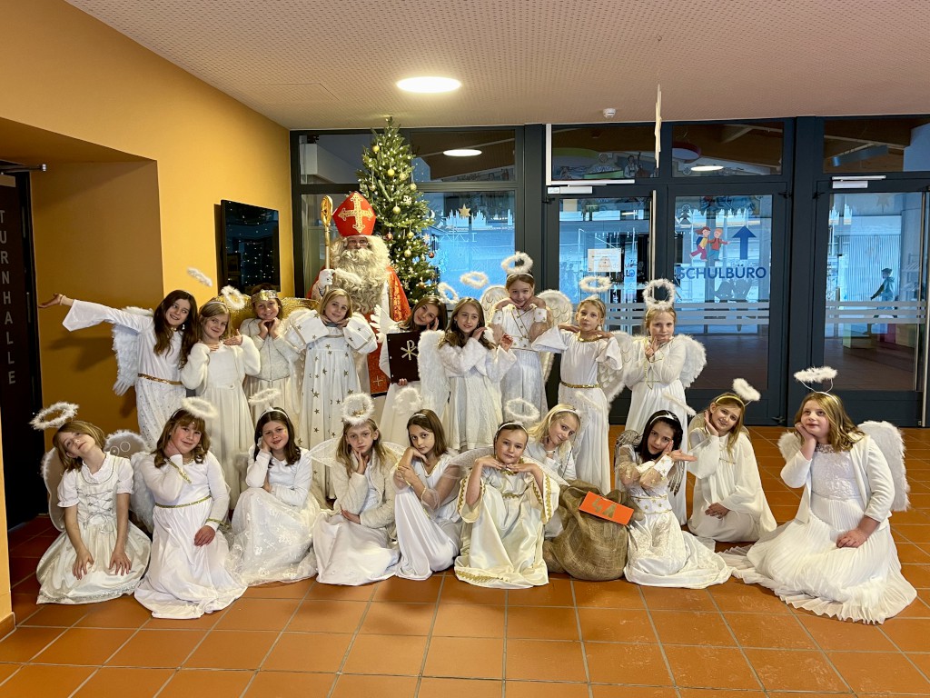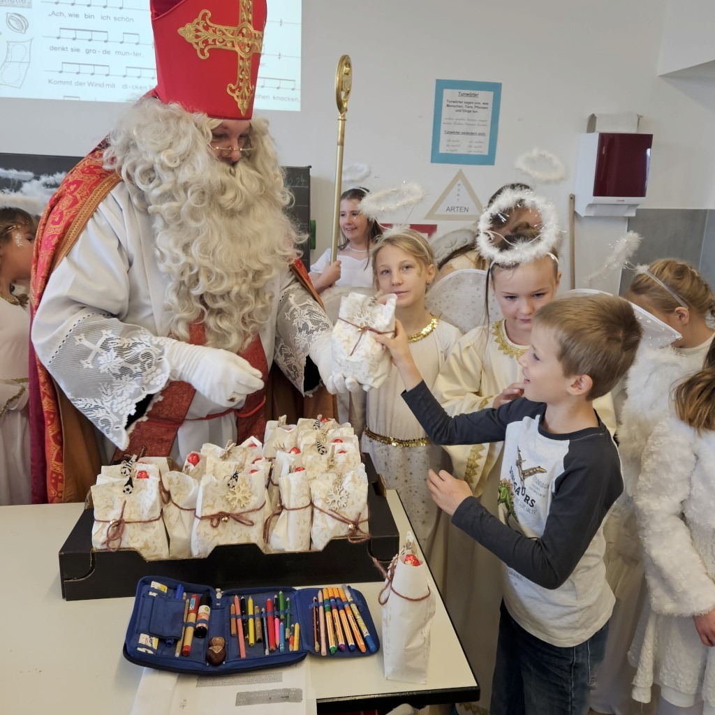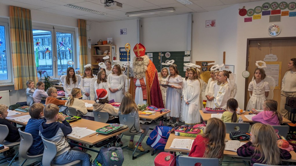 Am 5. Dezember 2024 herrschte in der Grundschule Inzell große Aufregung, denn ein besonderer Gast hatte seinen Besuch angekündigt: Der heilige Nikolaus zog zusammen mit seinen 21 Engeln durch die Klassenräume und sorgte für leuchtende Kinderaugen. Der Nikolaus nahm sich für jede Klasse Zeit und brachte nicht nur kleine Geschenke, sondern auch viel Freude und weihnachtlichen Zauber in die Grundschule mit.