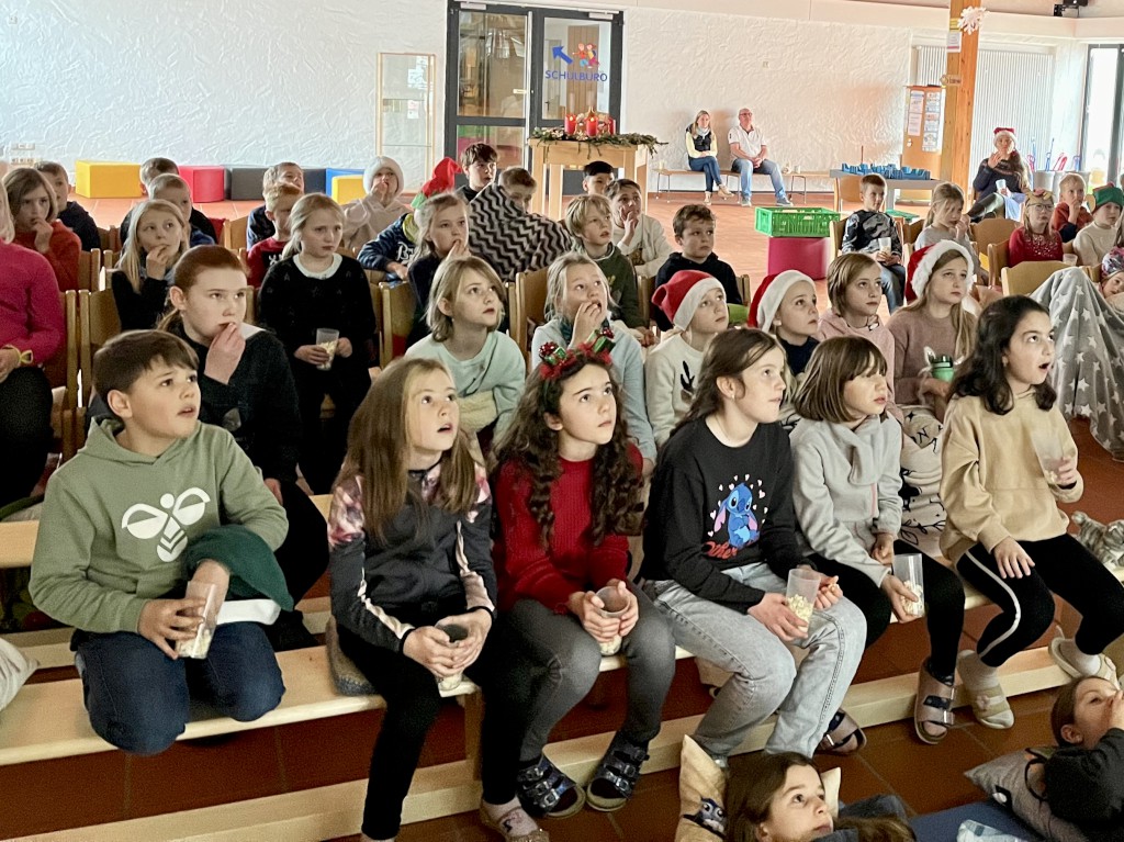 In der letzten Schulwoche vor den Weihnachtsferien wurde die Grundschule Inzell zu einem kleinen Kino umgestaltet. Alle Klassen versammelten sich in der festlich geschmückten Aula, um gemeinsam einen besonderen Film zu erleben. Diese schöne Aktion brachte nicht nur weihnachtliche Vorfreude, sondern förderte auch das Miteinander in der Schulgemeinschaft.
