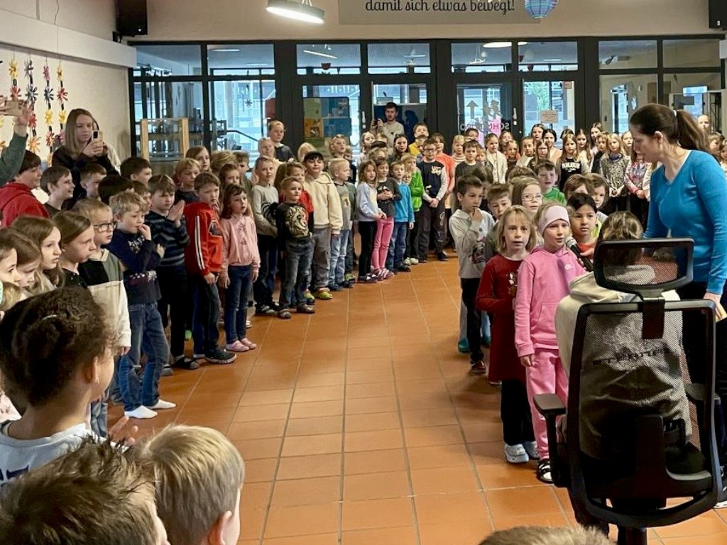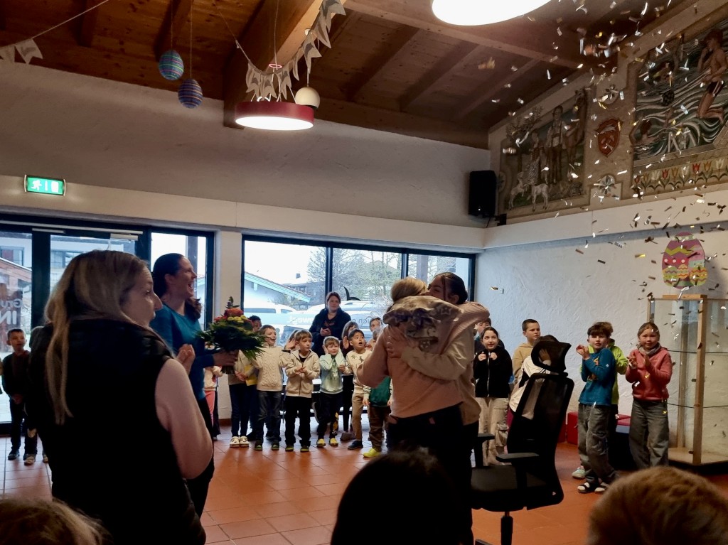 Zur feierlichen Verabschiedung versammelten sich alle Schüler und Lehrkräfte in der Aula. Mit dem Lied "Pfiadi und Servus und Habe-die-Ehr'" wurde Amelie musikalisch verabschiedet, bevor sich die Kinder mit liebevollen Worten und kleinen Gesten für ihre wertvolle Begleitung im Schulalltag bedankten. Auch das Kollegium sprach ihr große Anerkennung aus: Schulleiterin Elke Thurmayr sowie Lehrerin Kathrin Singer-Zellner fanden in kurzen Ansprachen herzliche Worte des Dankes. Als Zeichen der Wertschätzung erhielt Amelie einen wunderschönen Blumenstrauß und ein besonderes Abschiedsgeschenk. Der festliche Moment wurde durch eine glitzernde Konfettikanone abgerundet, die für fröhliche Stimmung sorgte.
