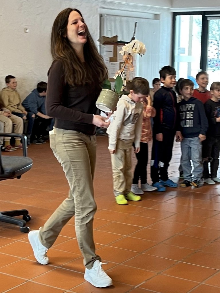 Nur wenige Lehrkräfte waren in den Scherz eingeweiht. So erreichte die Stimmung ihren Höhepunkt, als Herr Stollenmaier mit bewegten Worten der Schulleiterin für ihre Zeit an der Schule dankte und ihr als Dankeschön eine künstliche Blume überreichte. Doch gerade in diesem ergreifenden Moment folgte die große Auflösung: Mit einem lauten „April, April!“ enthüllte Herr Stollenmaier die wahre Natur der Veranstaltung – es handelte sich um einen Aprilscherz!