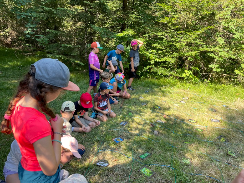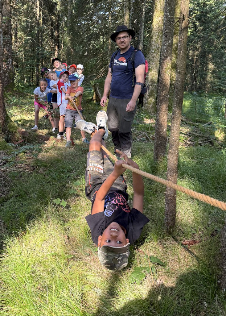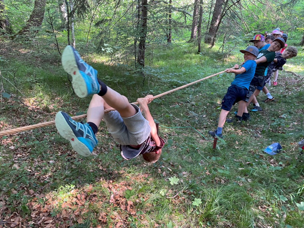 An verschiedenen Stationen mussten die Kinder ihr Teamwork unter Beweis stellen – ganz nach dem Motto: „Einer für alle und alle für einen“, denn nur gemeinsam als Klasse konnten die Herausforderungen bewältigt werden. Vom Balancieren auf einer schmalen Brücke bis zum „Nester bauen“ aus Naturmaterialien war Zusammenarbeit gefragt. Beim Quiz und dem Ertasten von Waldgegenständen wurden Wissen und Sinne geschult. Besonders spannend war die Station, bei der ein Kind an einem Seil über ein Hindernis hangelte, während die Klasse als Team kräftig zog.