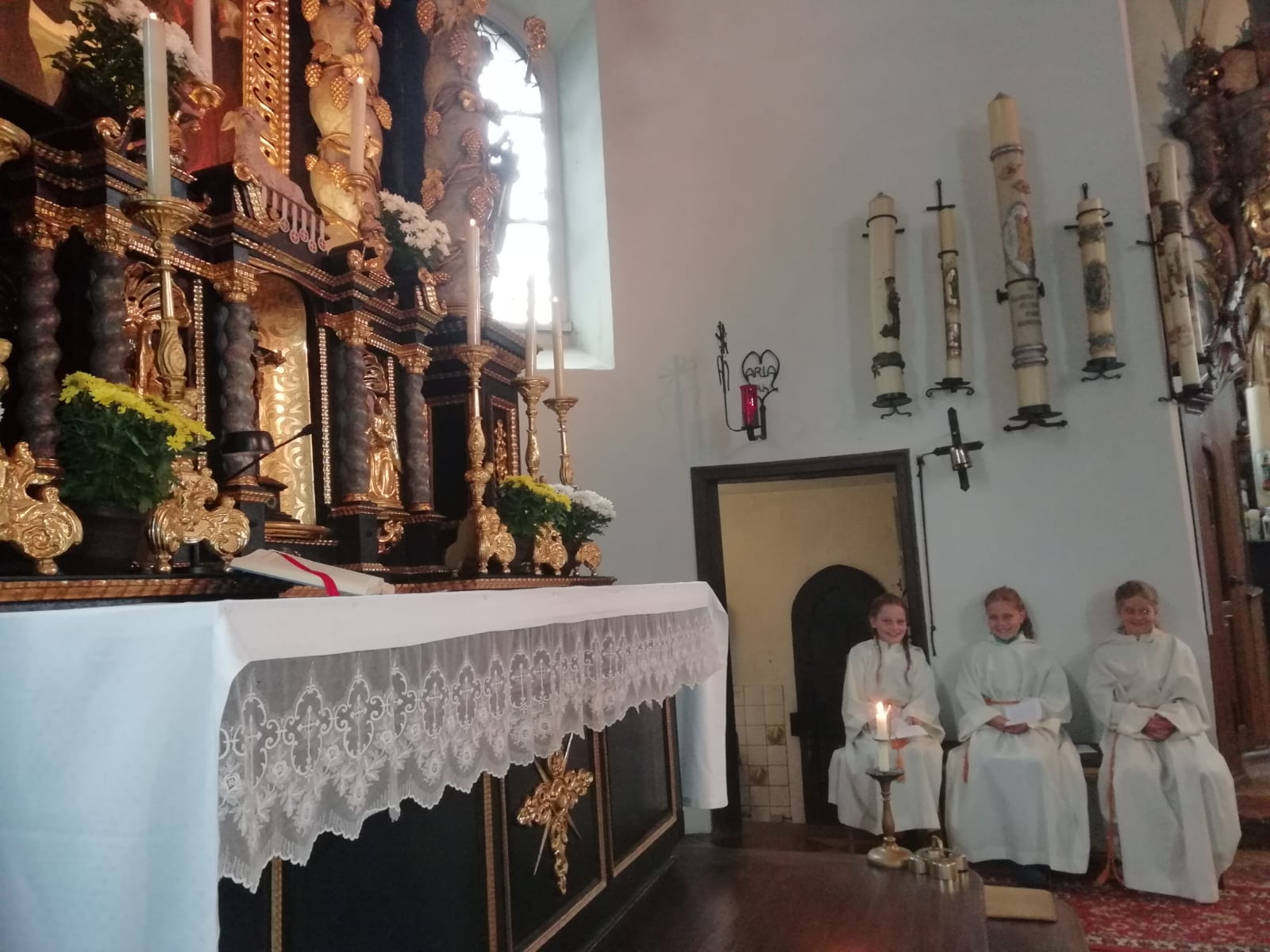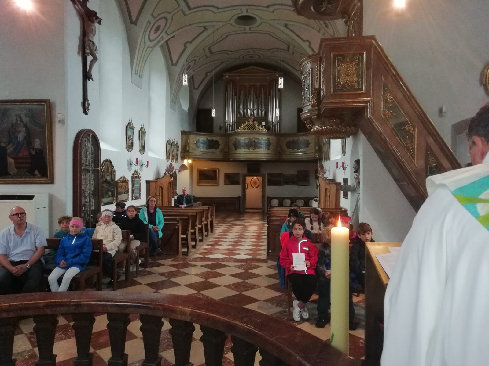 Nach der Ankunft und einer kleinen Spielrunde im Kreis machten sich die Kinder auf den Weg zur Wallfahrtskirche, wo sie gemeinsam Gottesdienst feierten. Der Mesner erklärte im Anschluss an die Heilige Messe viel Wissenswertes über die Geschichte und die Besonderheiten der Kirche, was bei den Kindern großes Interesse weckte.