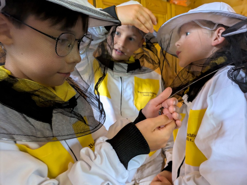 Ausgestattet mit neuem Wissen ging es anschließend zum Vereinsbienenhaus im Inzeller Kurpark. Dort zeigte Frau Kirmse blühende Pflanzen, die besonders beliebt bei Bienen sind. Außerdem durften die Kinder die vielfältigen Werkzeuge eines Imkers kennenlernen. Anschließend wurde es richtig spannend: In Schutzanzüge gehüllt, begleiteten die Klassen Herrn Schuhn auf eine Entdeckungsreise in den Bienenstock. Sie fanden Honigwaben, Brutkammern mit Eiern sowie emsige Arbeiterinnen und gemächlich umherkrabbelnde Drohnen. Viele der kleinen Besucher wagten es, eine stachellose männliche Biene auf der Hand krabbeln zu lassen.