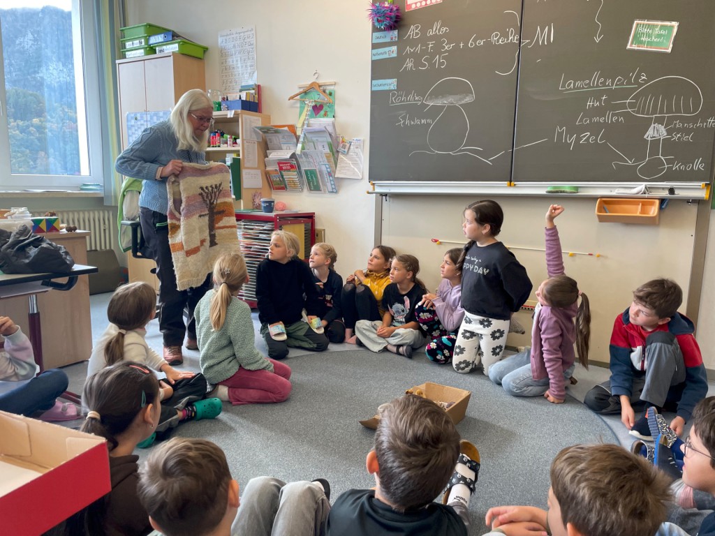 Zu Beginn stand etwa zwei Stunden lang Theorie auf dem Programm. Dabei erfuhren die Kinder eine Menge über die Welt der Pilze – zum Beispiel, dass das, was wir als „Pilz“ sehen, eigentlich nur der Fruchtkörper ist, während der eigentliche Pilz, das Myzel, im Boden lebt. Frau Künkele hatte verschiedene Pilzarten mitgebracht und erklärte, welche essbar und welche giftig sind – ein Thema, das die Kinder besonders fesselte. Sie konnten die Pilze genau betrachten und lernten, wie unterschiedlich sie aussehen und worauf man beim Sammeln achten sollte. Ein weiteres Highlight war das Thema „Färben mit Pilzen“. Frau Künkele zeigte eine Jacke, die mit Pilzen gefärbt wurde, sowie eine Mütze aus Pilzmaterial. Beides durften die Kinder anfassen – was sie natürlich besonders spannend fanden.