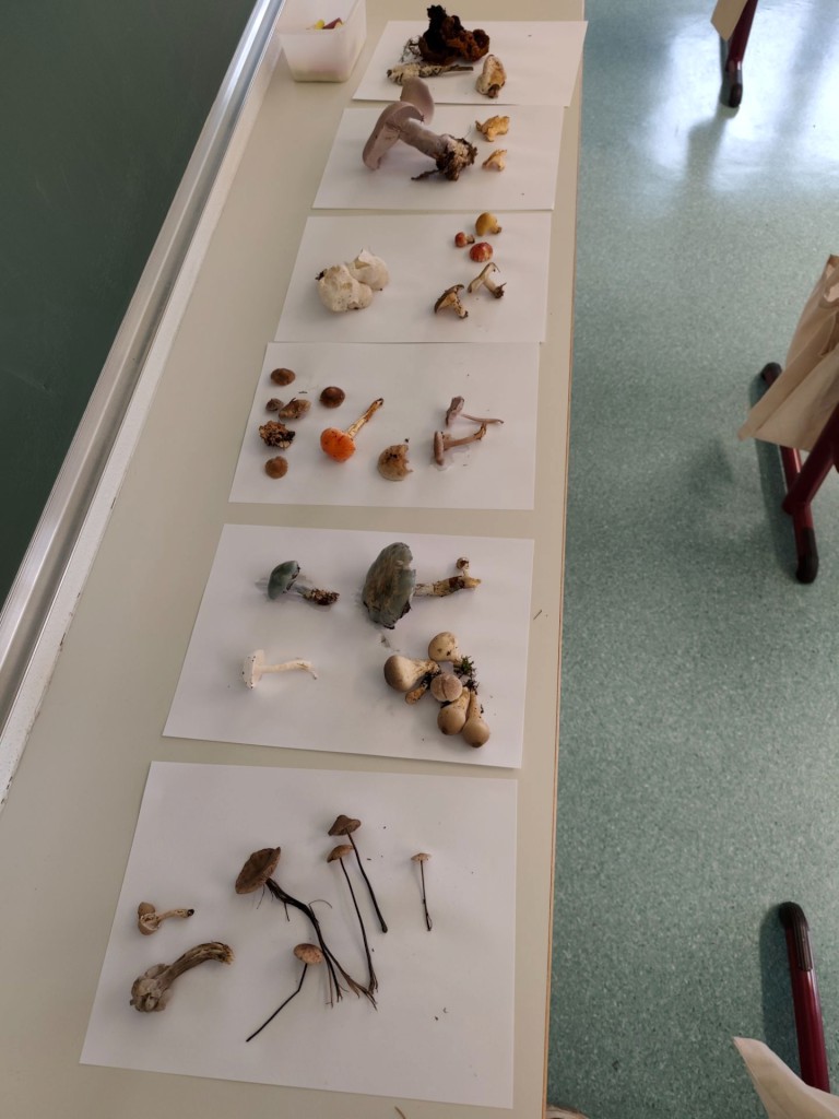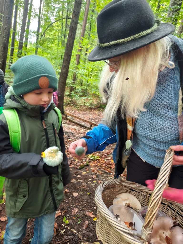 Nach einer kurzen Pause ging es in den nahen Wald. In kleinen Gruppen machten sich die Kinder auf die Suche nach Pilzen in möglichst vielen verschiedenen Farben. Hochmotiviert entdeckten sie zahlreiche Arten, einige mit ganz ungewöhnlichen Gerüchen – etwa nach Knoblauch oder Radieschen!