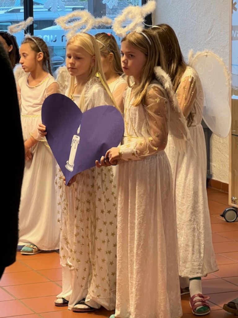Die Herz-Symbole begleiteten die Andachten und blieben in der Schule sichtbar, sodass der Adventsweg auch über die Feiern hinaus im Schulalltag präsent war. Besonders die aktive Beteiligung der Kinder, etwa durch die Fürbitten der Drittklässler sowie die Unterstützung durch die Engerl aus den 4. Klassen machte die Andachten zu einem gemeinsamen, besinnlichen Auftakt in die Weihnachtszeit.
