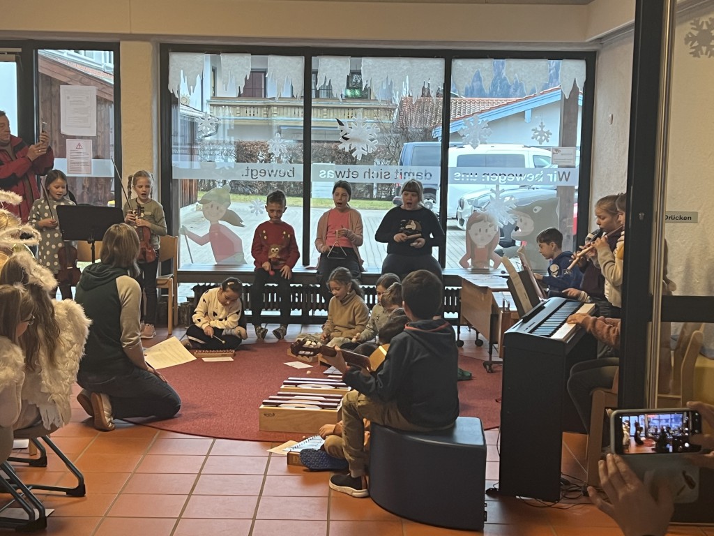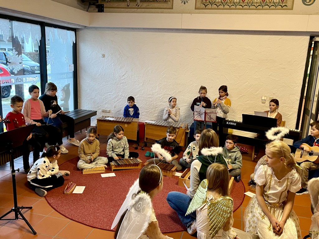 Besonders beeindruckend war die Darbietung der Klasse 3a unter Leitung von Lehrerin Maria Moser: Mit Gesang und Instrumentalbegleitung auf Orff-Instrumenten, Gitarre, Geige, Klavier und Blockflöte präsentierten sie das Lied „Wenn die erste Kerze brennt“. Maria Moser hatte ihre Schülerinnen und Schüler mit großem Engagement auf diesen Auftritt vorbereitet.