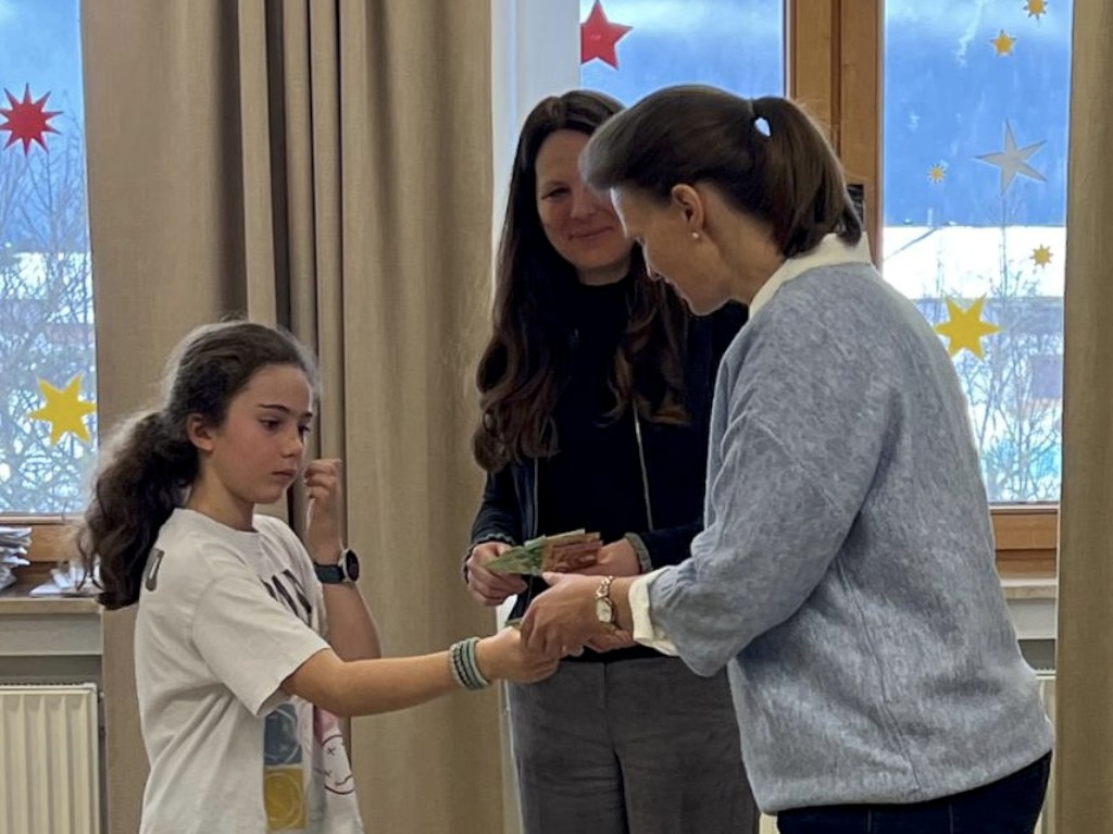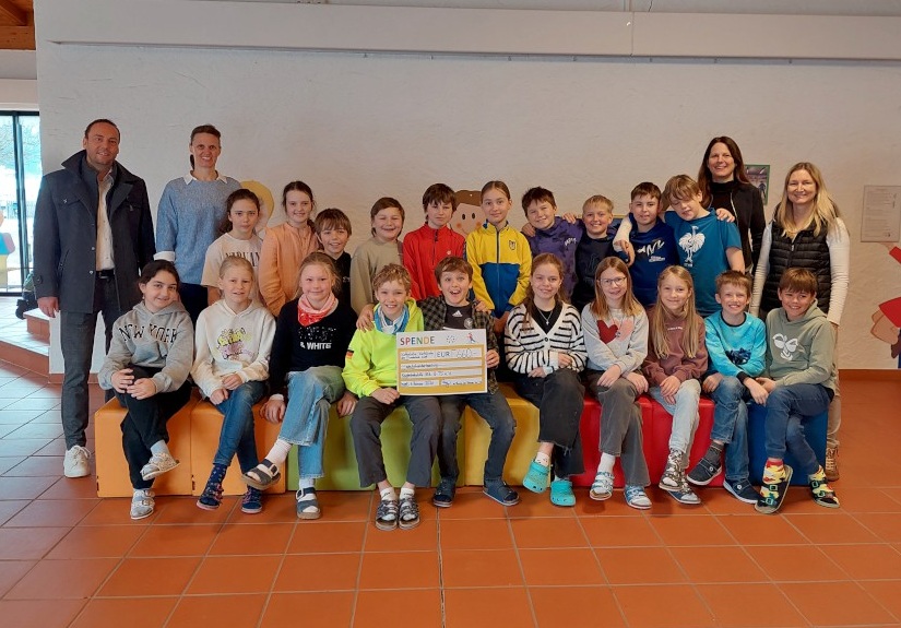 Bereits am Tag zuvor waren die Kinder gemeinsam mit ihrer Religionslehrerin zur Bank gegangen, um das gesammelte Kleingeld der Spendenaktion in Scheine zu wechseln. Einige Kinder durften Frau Schuhbeck bei der Spendenübergabe den Geldschein persönlich überreichen – ein besonders bewegender Moment für alle Beteiligten.