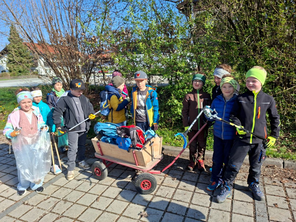 Ausgerüstet mit Eimern, Müllsäcken, Handschuhen, Müllzangen und sogar Leiterwagen waren die Kinder hochmotiviert im Einsatz. Der gesammelte Abfall wurde sorgfältig verpackt und an vereinbarten Sammelpunkten abgelegt, wo ihn später der Bauhof abholte. Auf kürzeren Strecken transportierten die Kinder die gefüllten Säcke sogar selbst zurück zur Schule.