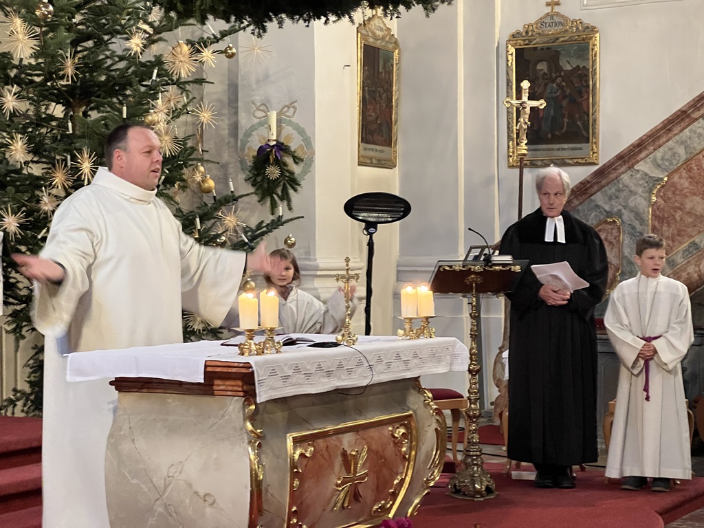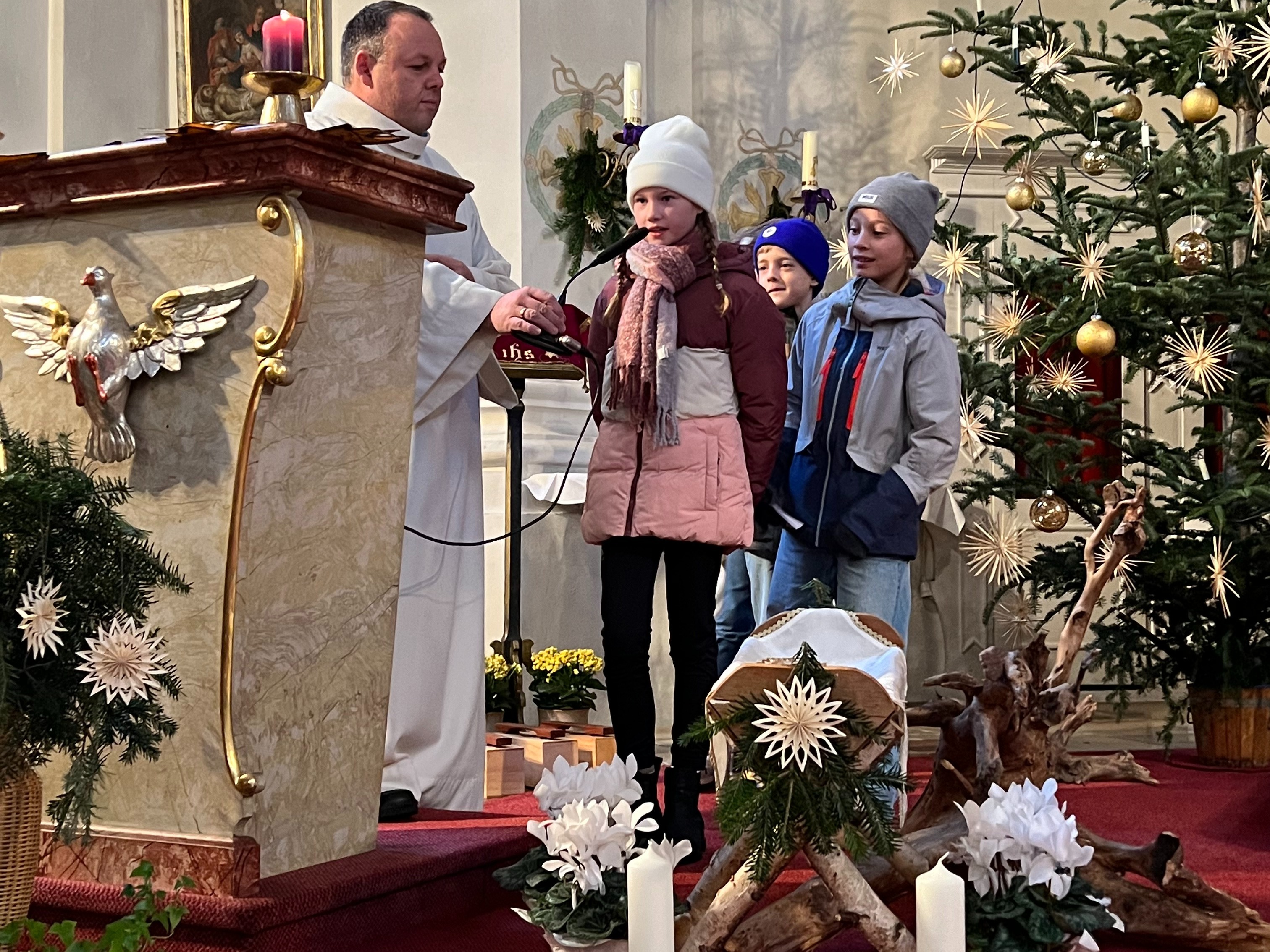 Alle Jahre wieder steht Weihnachten vor der Tür und die Schulfamilie nahm dies als Anlass, am letzten Schultag vor den Weihnachtsferien einen ökumenischen Gottesdienst zu feiern. In der weihnachtlich geschmückten Pfarrkirche stimmten zu Beginn alle gemeinsam das Lied „Wir sagen euch an den lieben Advent“ an, während die Kinder der 2. Klasse alle vier Strophen begeistert mit passenden Bewegungen choreografierte.