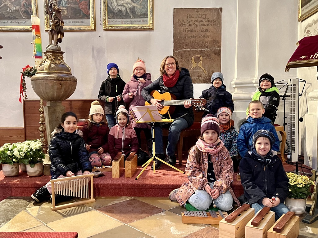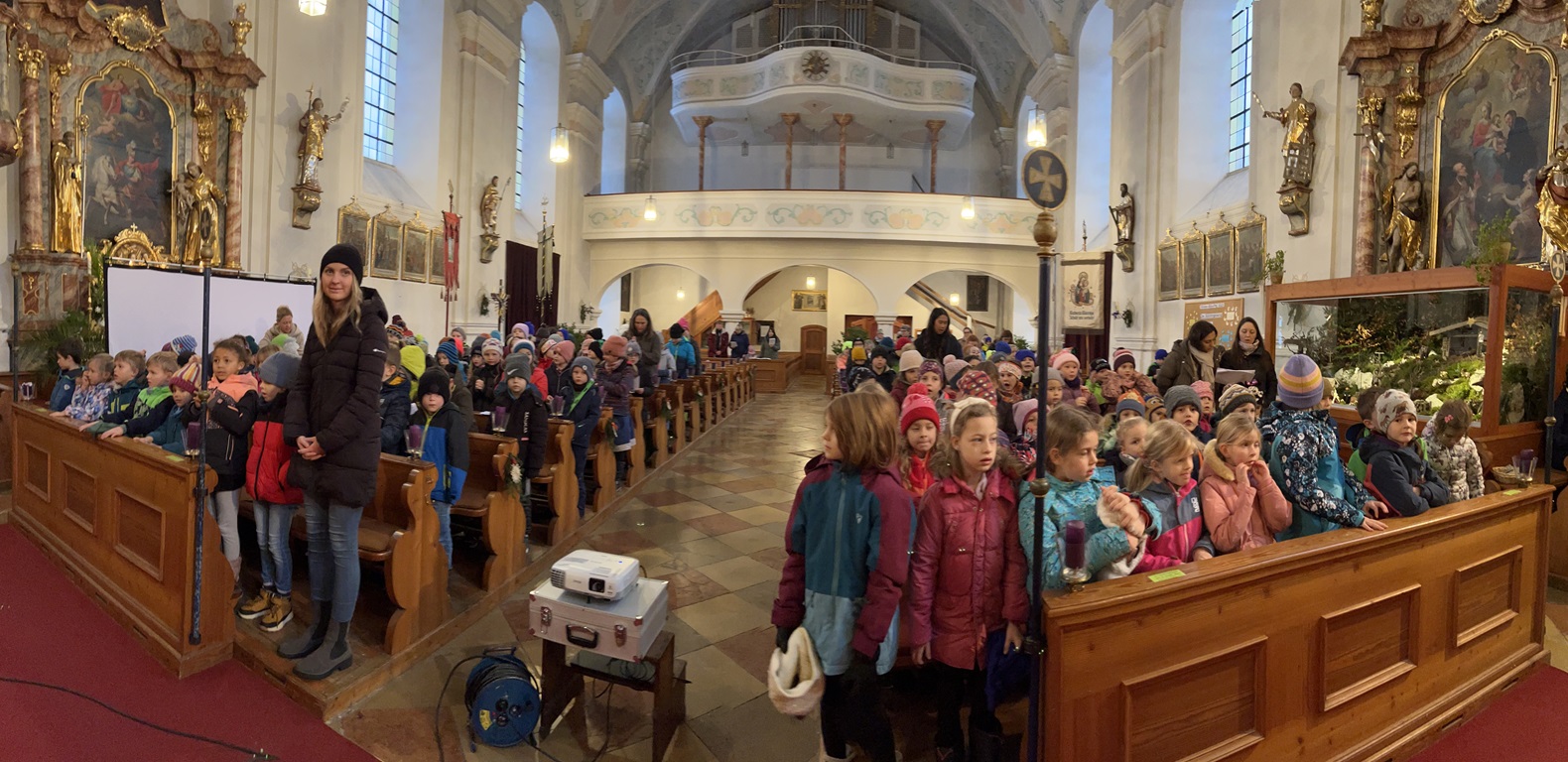 In den vergangenen Schulwochen haben die Schüler und Schülerinnen auf ganz unterschiedliche Art und Weise anderen Menschen eine Freude bereitet. So haben sie unter anderem die Senioren im Chiemgaustift besucht und mit weihnachtlichen Liedern erfreut, den Kindergartenkindern Geschichten vorgelesen oder auch Plätzchen gebacken und diese anschließend an die Schulfamilie verteilt. An diese schönen Aktionen wurde im Gottesdienst mithilfe einer Bilderpräsentation erinnert, zu der die beteiligten Kinder ihre jeweilige Aktion mit Freude vorstellten. Eindrucksvoll wurde in den Gesichtern der Kinder sichtbar, dass die Freude, die sie anderen bereitet haben, auch zu ihnen selbst zurückkam. Solche Aktionen bringen Licht ins Leben aller Beteiligten. Passend dazu sangen die Kinder mit Frau Rothgänger das Lied „Immer heller“ und mit jeder Vorstellung dieser Aktionen strahlte der Stern in der Kirche noch mehr.