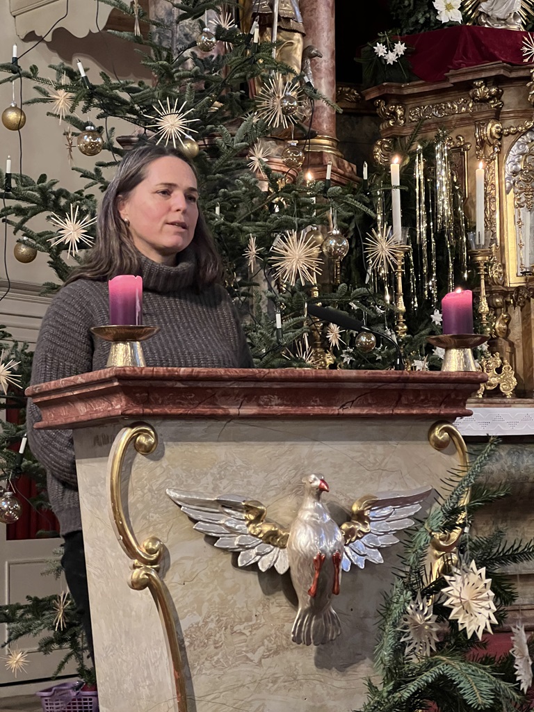Anschließend wurde die Geburt von Jesus thematisiert. Als besondere Sternstunde erfuhren die Hirten vor 2000 Jahren diesen einmaligen Moment, in dem sie dem menschgewordenen Gott in der Krippe begegneten. Eindrucksvoll und mit Bildern untermalt, erzählte Pfr. Tomas Seitz die „Heilige Nacht“ von Selma Lagerlöf, in welcher der Wandel eines mürrischen Hirten vom ablehnenden Menschen hin zu einem hilfsbereiten Mann erzählt wird. Erst Güte und Herzlichkeit ermöglichten ihm schließlich zu erkennen, was vorher verborgen blieb. So erlebte der Hirte eine besondere Sternstunde in seinem Leben.