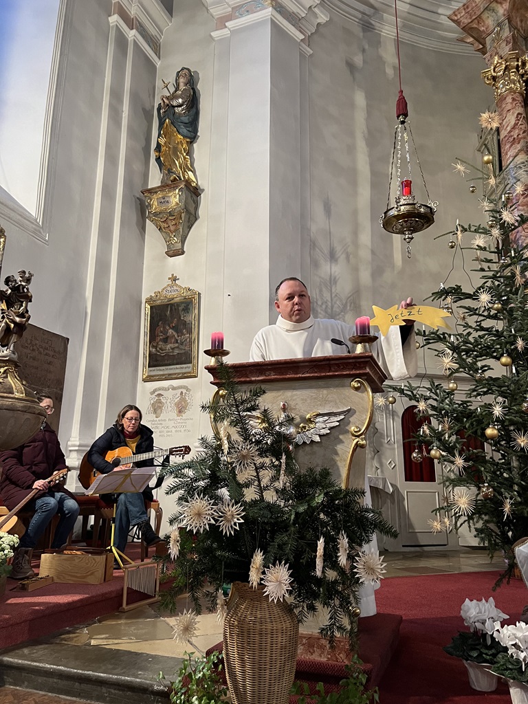 Dem Friedensgruß und herzlichen Weihnachtsgrüßen folgte der ökumenische Schlusssegen, ehe das Lied „Am Kranz brennt a Kerzerl“ angestimmt wurde. Zum Abschluss der Andacht präsentierte die Film-AG um Herrn Stollenmaier noch ihren Videoclip zur Musik von „Feliz navidad“ und brachte durch die Fotos aus dem aktuellen Schuljahr die Herzen der Schulfamilie schließlich gänzlich zum Strahlen. Viele waren sich nach dem Gottesdienst einig: Das war auch eine Sternstunde.